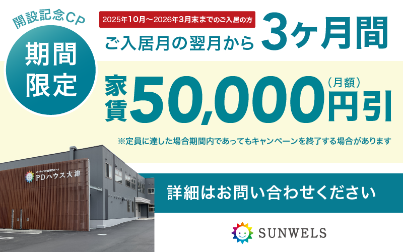 PDハウス大津の施設スローガン【~㋔穏やかに ㋔大きな心で ㋡紡ぐ幸せ」の通りに施設スタッフが一丸となり、入居者の皆様を全力でサポートします。