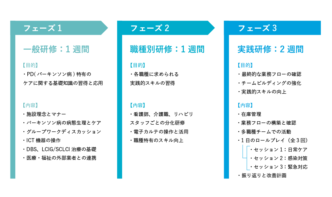 開発された教育プログラムは、施設勤務前のスタッフを対象とし、座学だけでなく実践的な要素を取り入れた構成を採用しています。