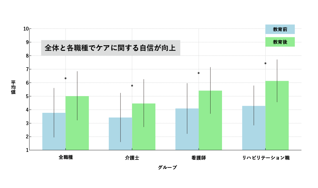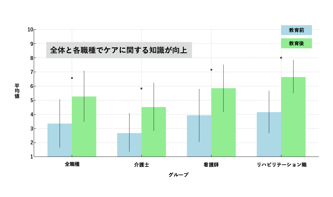 対象は看護・介護・リハ職の117名です。主要アウトカムは緩和ケアに関する自己評価の「知識」と「自信」(1~10点)とし、End-of-Life Professional Caregiver Survey(EPCS)およびTeam STEPPS Teamwork Attitudes Questionnaire (T-TAQ)を副次アウトカムとしました。その結果、主要アウトカムの自己評価(知識・自信)はいずれも有意に向上。副次アウトカムのEPCSも全項目で向上し、T-TAQは一部項目で有意な向上が確認されました。