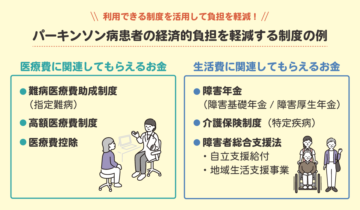 パーキンソン病にかかる医療費について、利用できる助成や控除の制度があります。