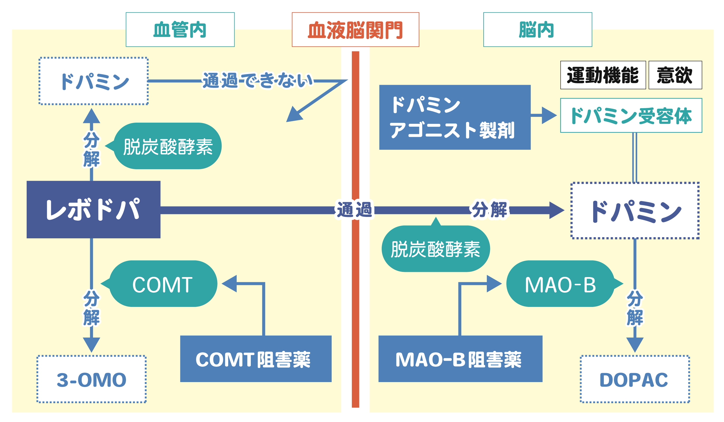 ドパミンの効果を長持ちさせる薬として、MAO-B阻害薬とCOMT阻害薬があります。