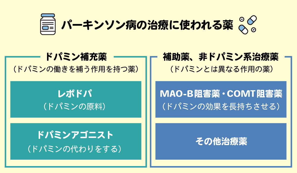 このほか、ドパミン放出促進薬、抗コリン薬、ノルアドレナリン系作用薬、レボドパ作用増強薬、アデノシンA2A受容体拮抗薬なども、症状や目的に応じて使われます。