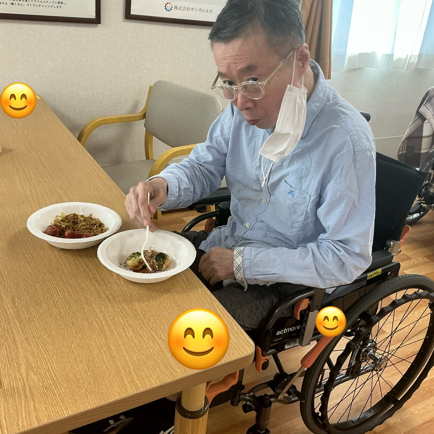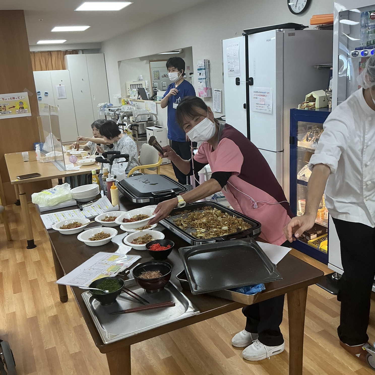 おやつの時間には、食堂が屋台に大変身!焼きそば・たこ焼き・フランクフルトをご用意し、まるで本物のお祭りに来ているような雰囲気の中で味わって頂きました。