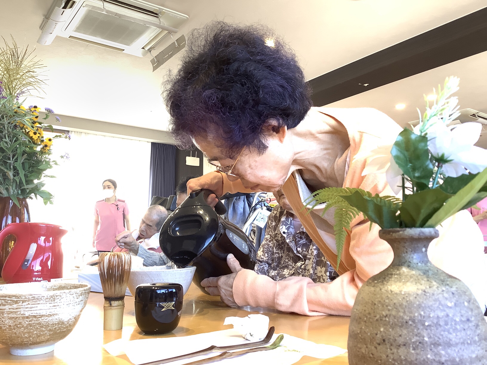 以前お茶の先生をされていた利用者様に教わりながら、素敵なお茶碗を並べ、