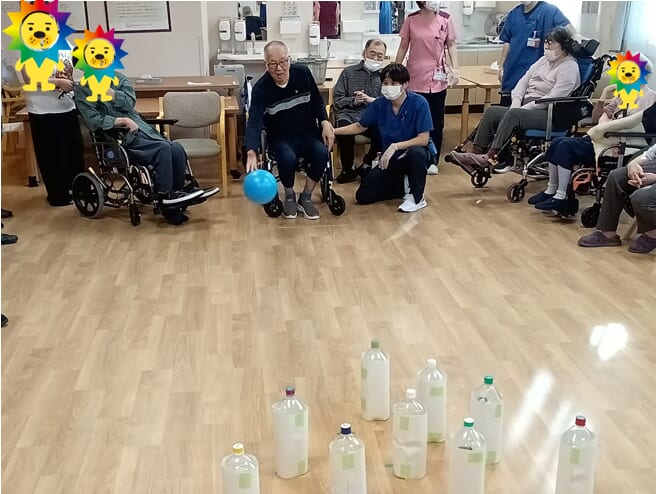 ペットボトルのピンをめがけてボールを転がすボウリング大会を開催。力加減や方向を考えながら投げる姿に、周囲から「ナイス!」の声が飛び交いました。ストライクが出るたびに、会場は大きな歓声に包まれました。