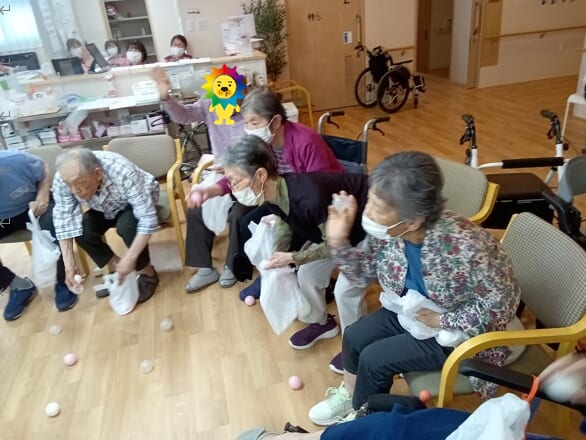 玉入れを行い赤組・白組に分かれて、制限時間内にどれだけ多くの玉をカゴに入れられるかを競いました。ご利用者の皆さんは、狙いを定めて玉を投げる姿がとても真剣で、応援の声にも熱が入りました。拍手喝采の盛り上がりでした。