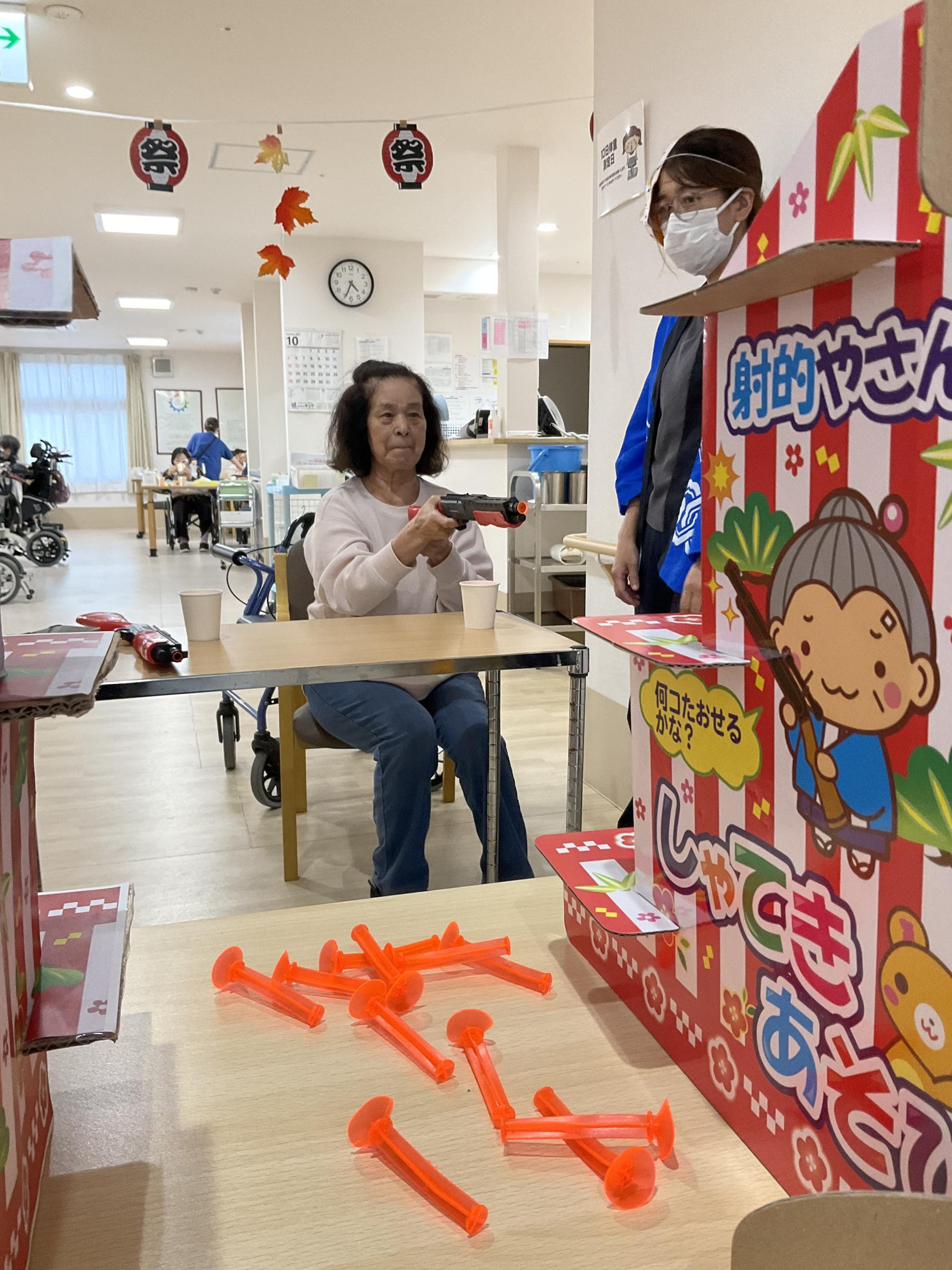 また食べ物のみではなく、射的コーナーも設けると利用者の皆様普段見ない真剣な表情で狙いを定めておられました。
