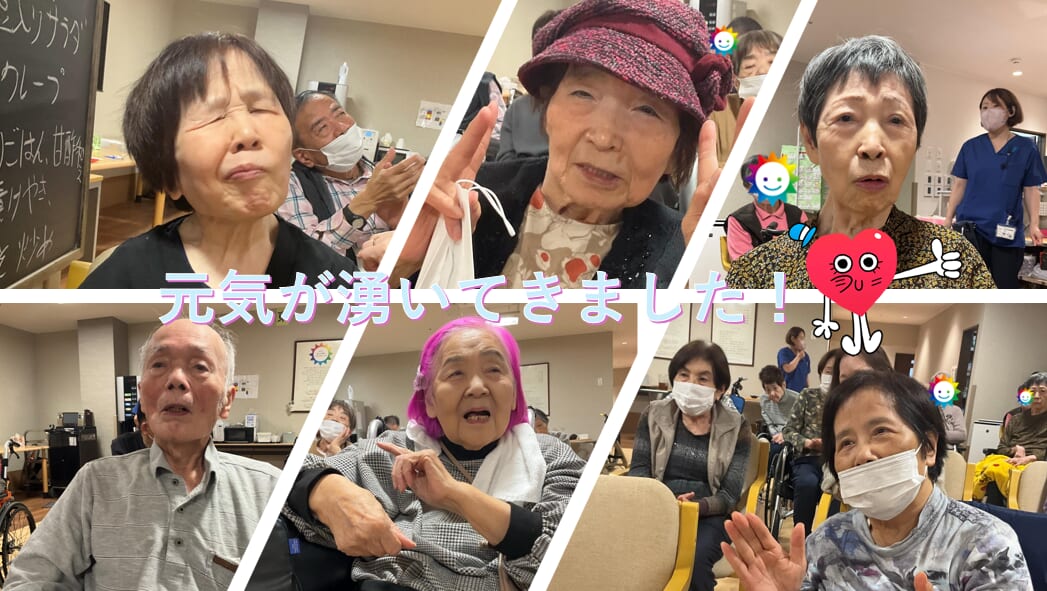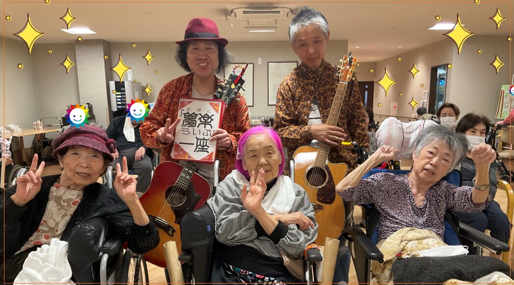 力強いギターの音色🎵に合わせて、入居者様も自然と手拍子👏が生まれ、大きな声で一緒に歌ったり、施設全体が活気に満ち溢れていました。