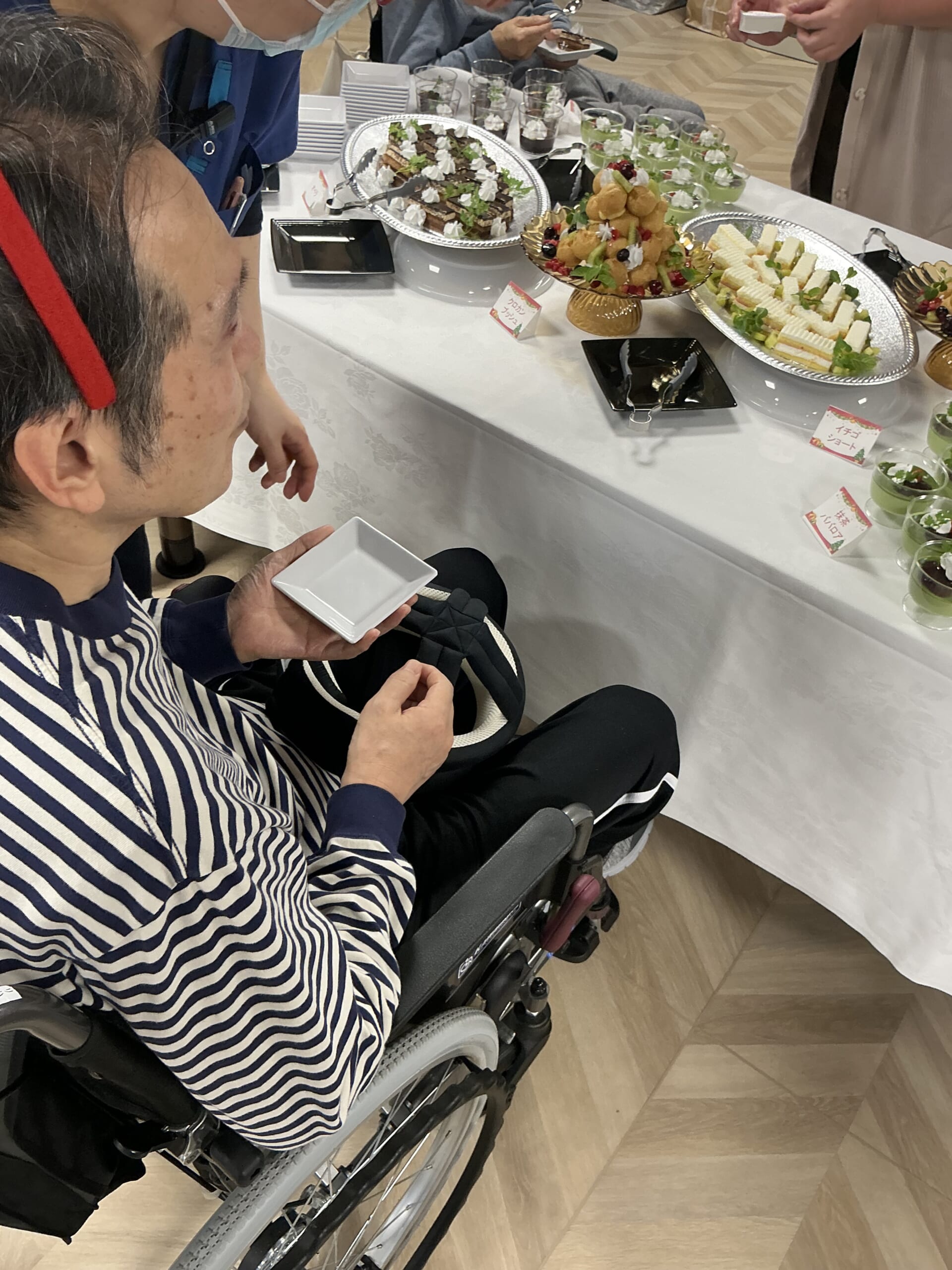 音楽を楽しんだ後は、お待ちかねのケーキバイキングです。 色とりどりの豪華なケーキが並ぶ光景に、皆様の目もキラキラと輝きます。「どれにしようかな?」と選ぶ楽しさと、甘いスイーツの美味しさに、会場のあちこちで満面の笑みがこぼれていました。