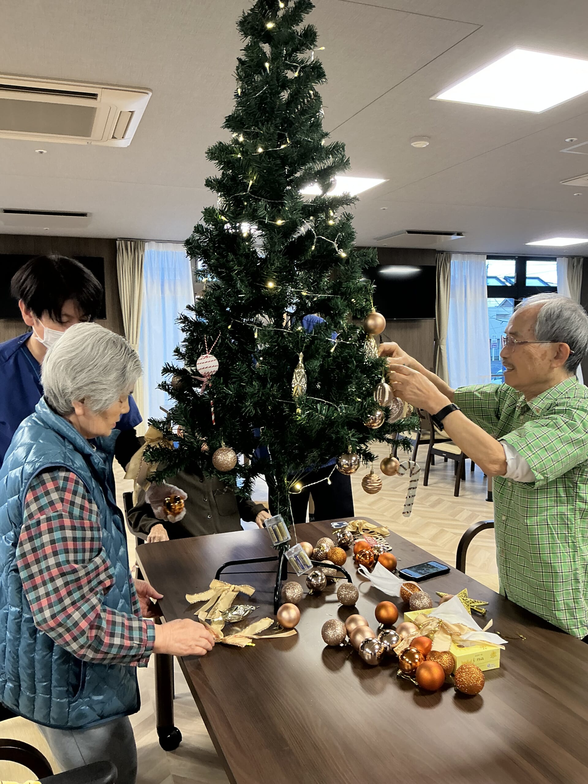 イベント前から、利用者様と職員が協力して準備を進めてきました。大きなクリスマスツリーの飾り付けはもちろん、手作りの装飾品も一つひとつ心を込めて作成。館内は一気にクリスマスムード一色になり、当日への期待に胸を膨らませました。