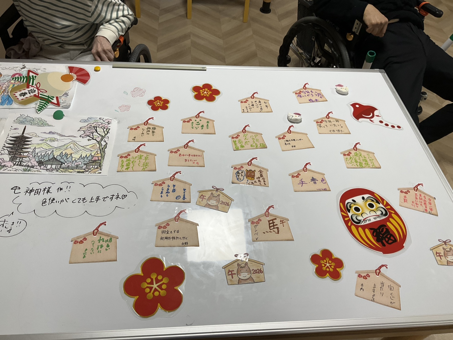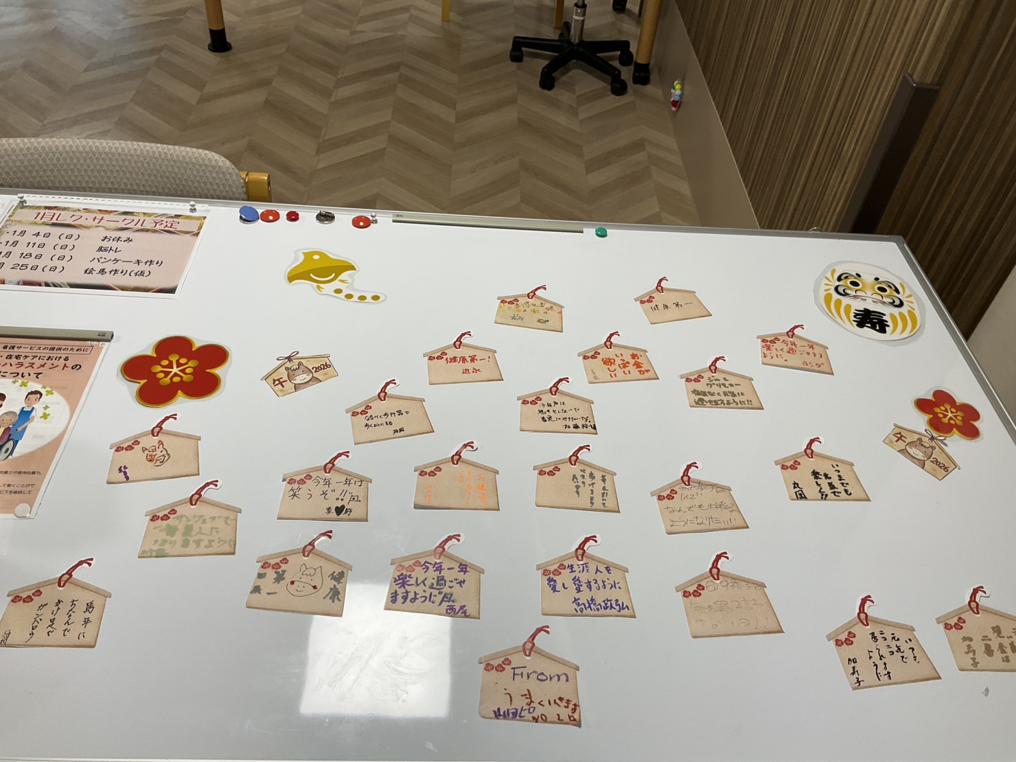 書いて頂いた絵馬は各階のホワイトボードに貼って頂き、ラミネートした梅の花や達磨等で飾り付けもして頂きました🥰