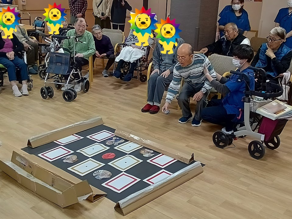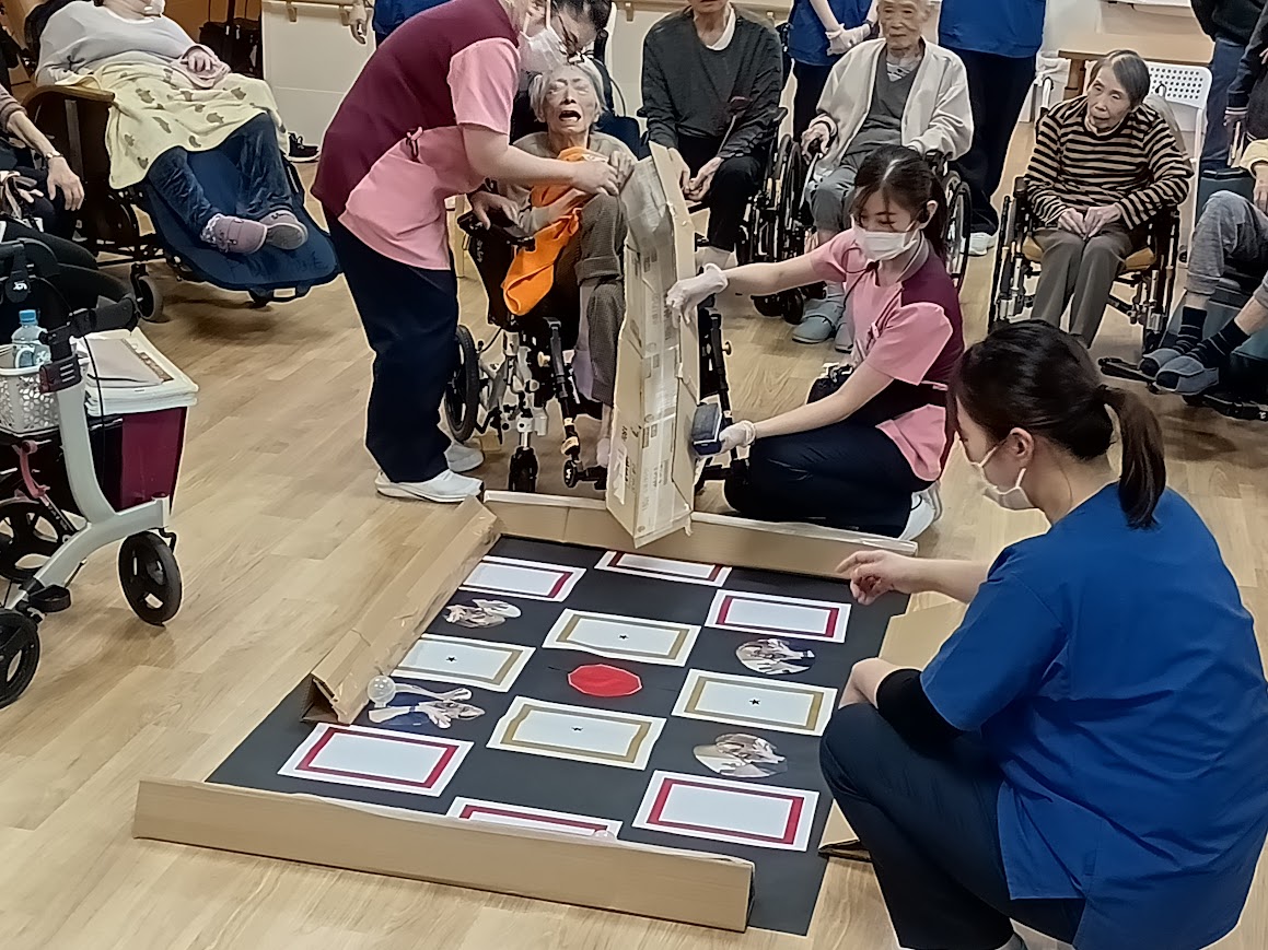 まずは毎年恒例(?)のお年玉ゲームからスタート。ボールやお手玉を狙った場所に投げるシンプルなゲームですが、皆さん表情は真剣そのもの。 高得点が出るたびに歓声が上がり、会場は大いに盛り上がりました。