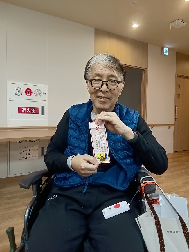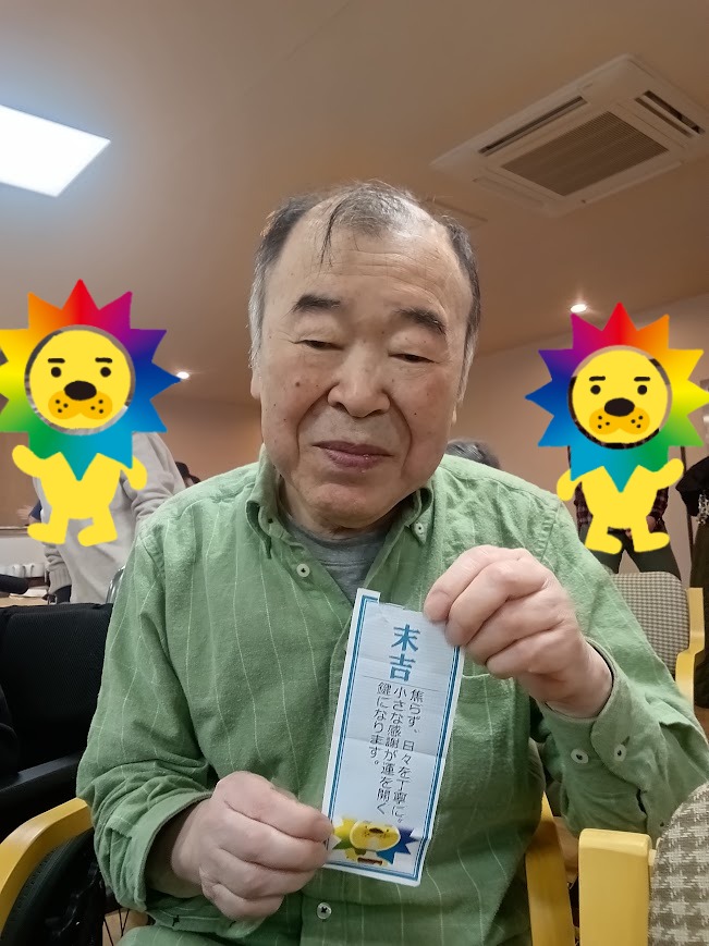 続いては、職員が心を込めて作ったオリジナルおみくじを引いていただきました。 「大吉だったよ」「面白い内容が書いてあったよ」と、皆さんそれぞれに楽しんでくださり、 手作りならではの温かさを感じていただけたようです。