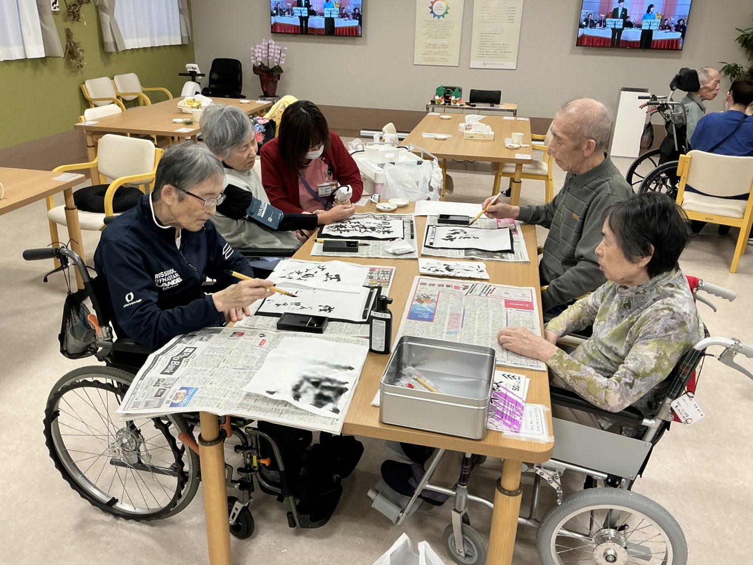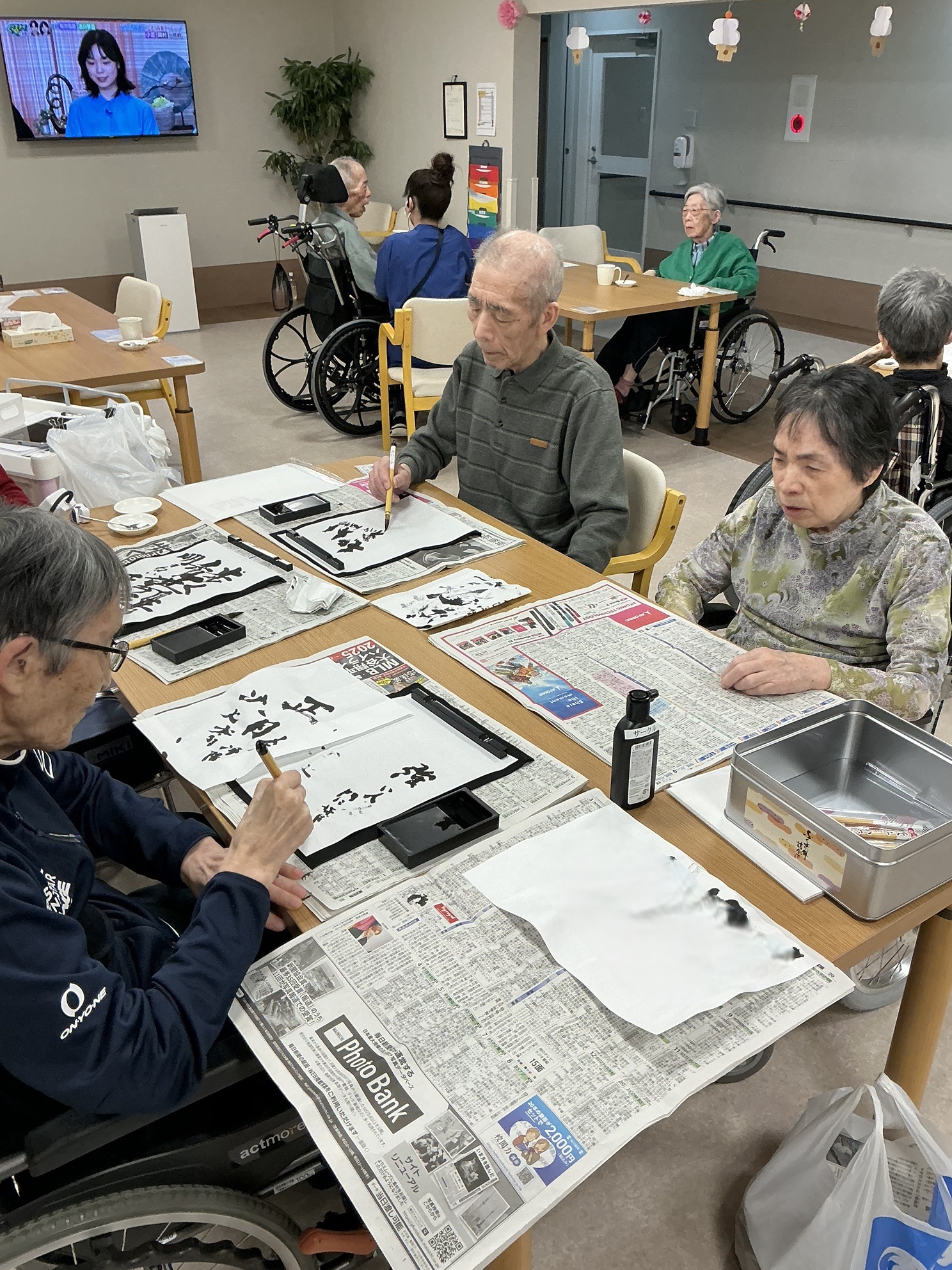 今回は、1月に行われた書き初め行事と、学生ボランティアの方々による
