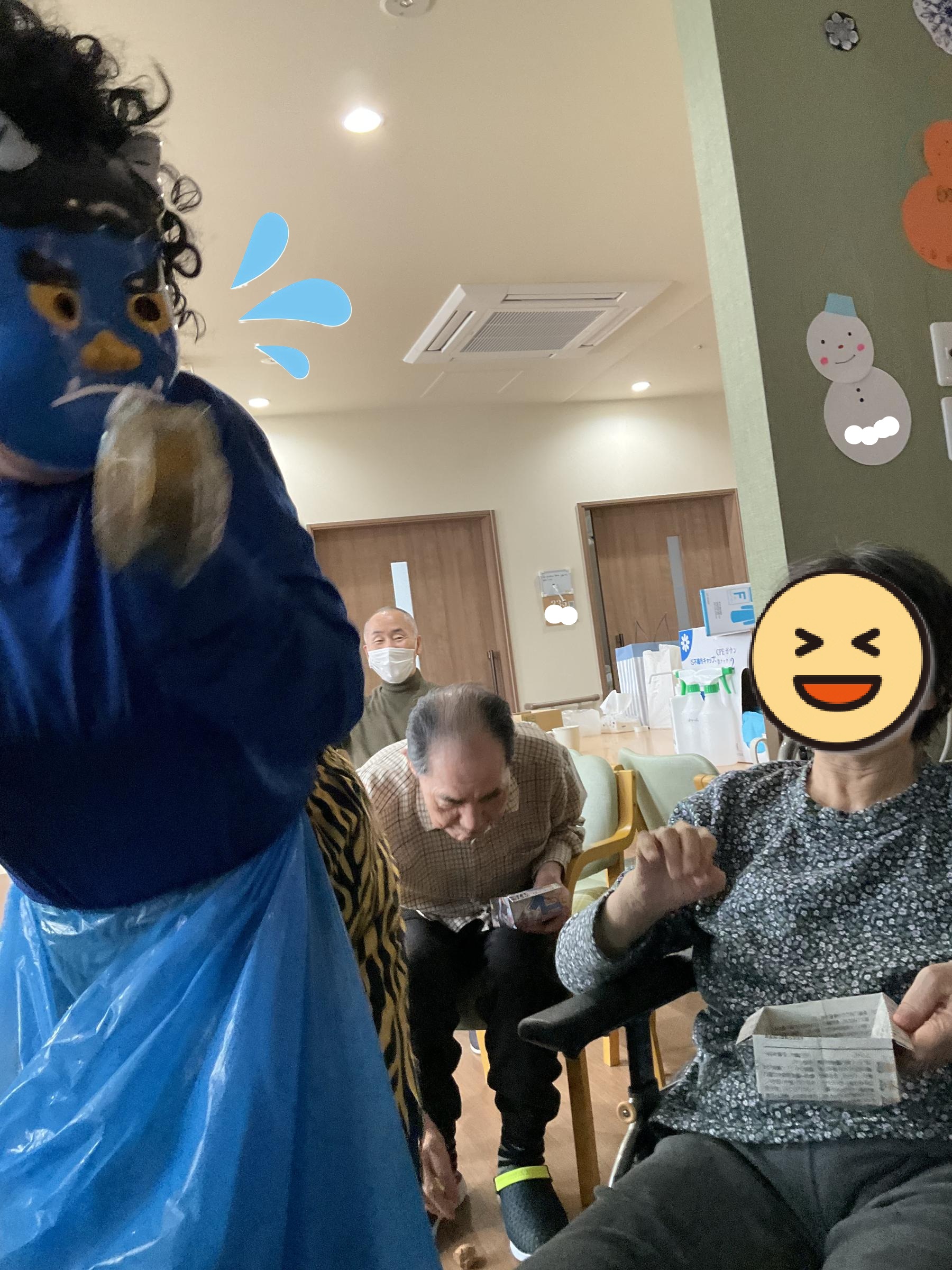 ニコニコとみなさん良い表情で、すっかり鬼たちと打ち解けたところで豆まきスタートです!