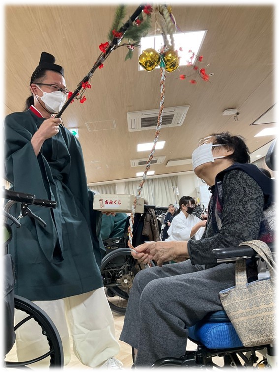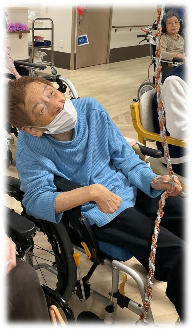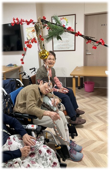 入居者さまにはひもで本坪鈴を振り鳴らし、今年のお願いごとを拝んでいただきました✨