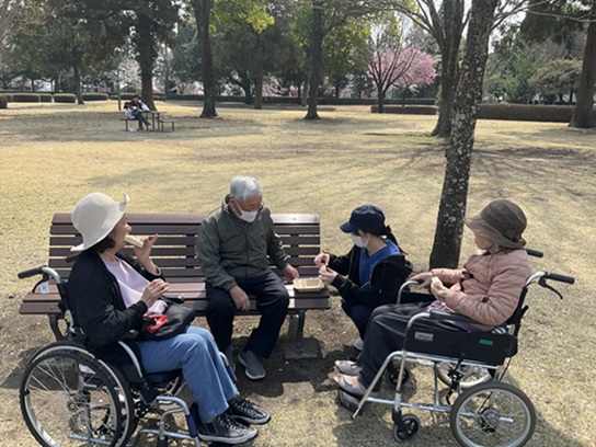 ご家族様の中にはサンドイッチやおやつなどを持って来て下さる場面もあり、桜を眺めながら一緒にお召し上がりになるなど、和やかな時間が流れていました。