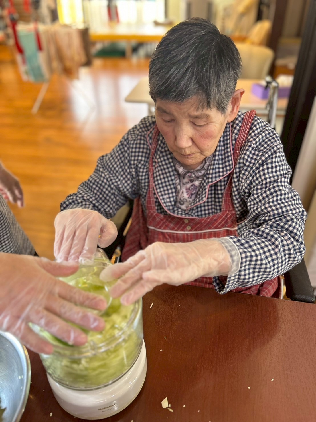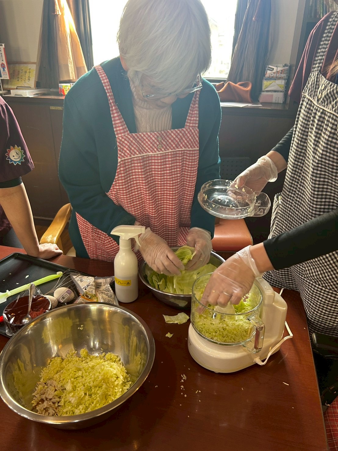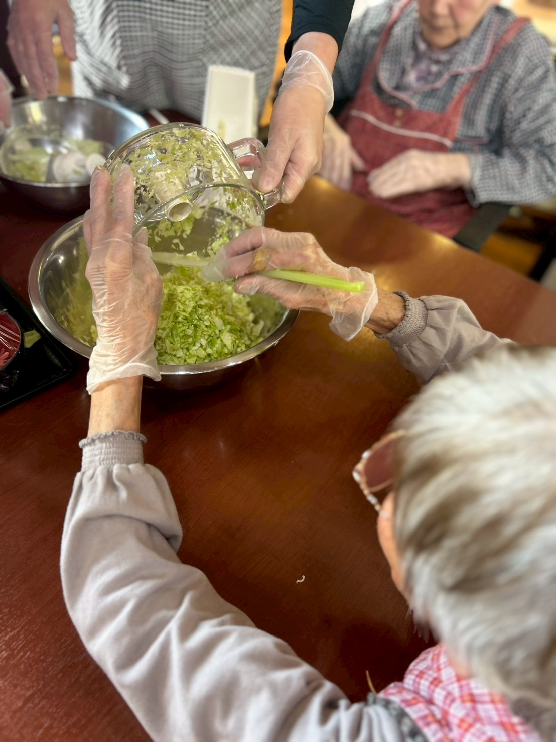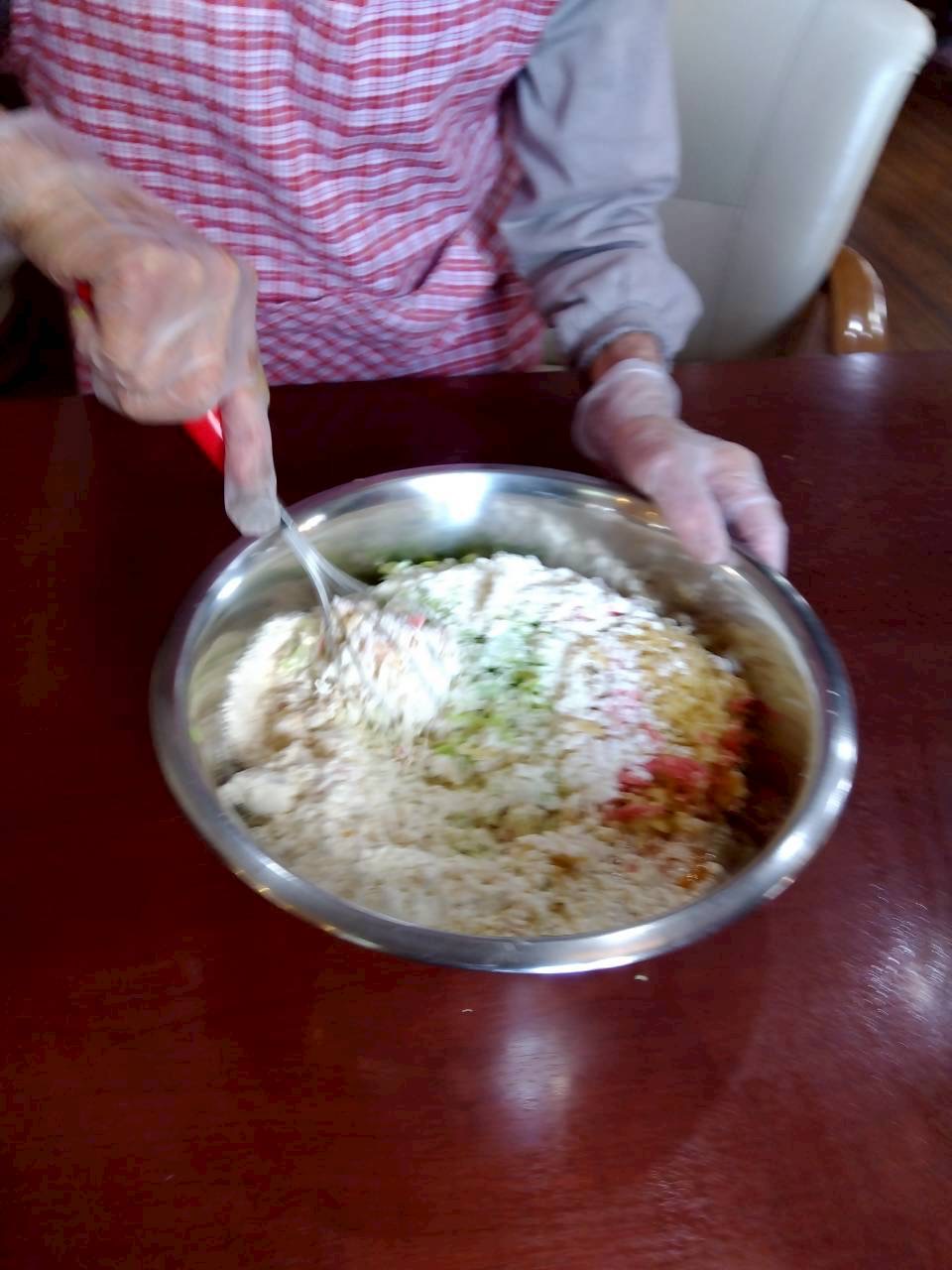 キャベツや天かす紅ショウガ等の材料を砕いて混ぜ合わせていきます。