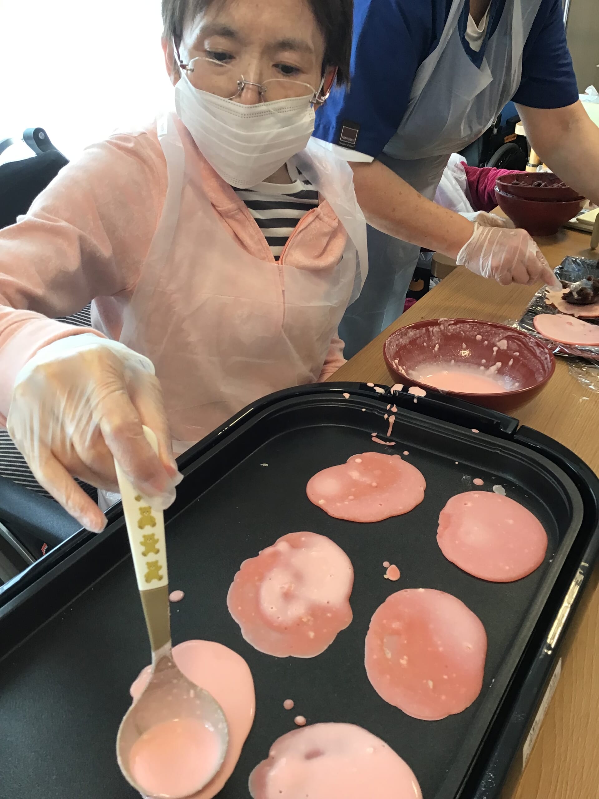生地を作る方、あんこを準備する方、桜の葉を並べる方と