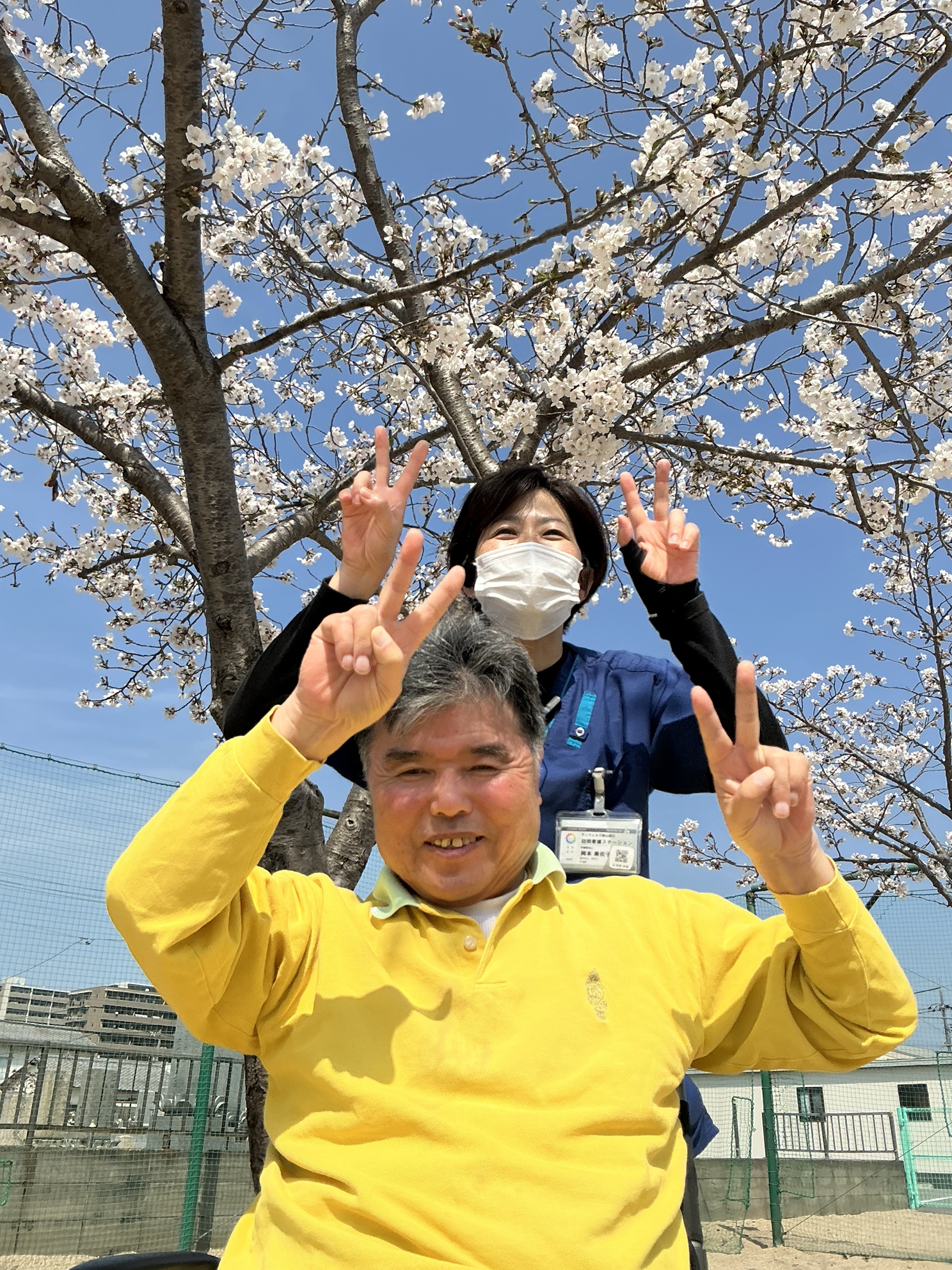 PDハウス岡山辰巳のすぐ側には公園があり、公園の敷地内に桜の木が幾つか植えられています。満開にはもう一歩というところではありましたが、美しく開いた桜の木の下で、職員も利用者様も心が安らぎ笑顔が広がりました。